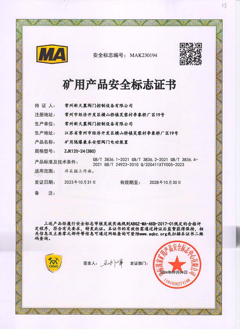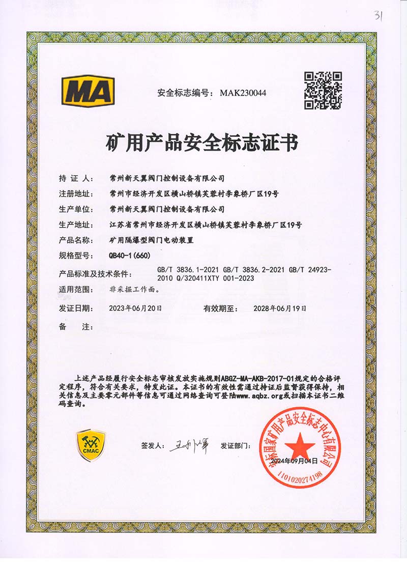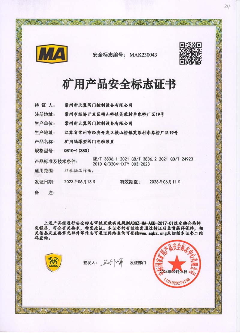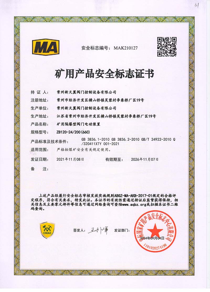 礦用產(chǎn)品安全標志證書ZB30-24 200(660)