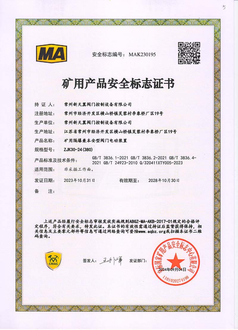 礦用產(chǎn)品安全標志證書ZJK180-24(380)