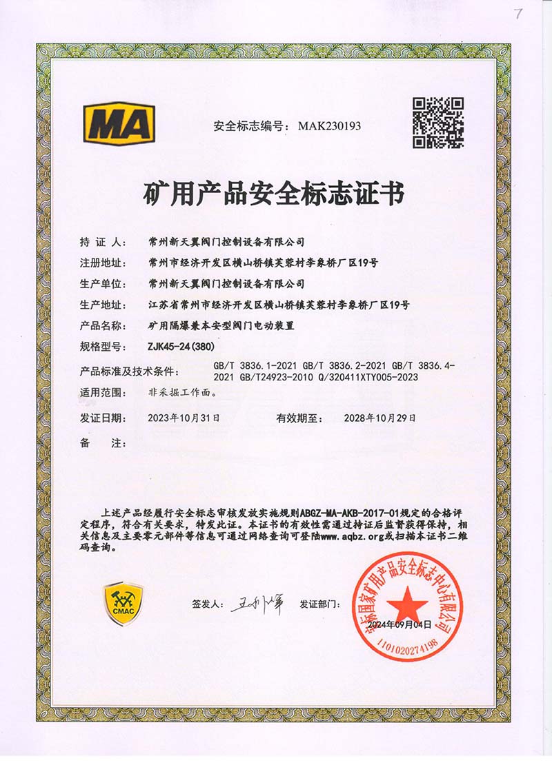 礦用產(chǎn)品安全標志證書ZJK45-24(380)
