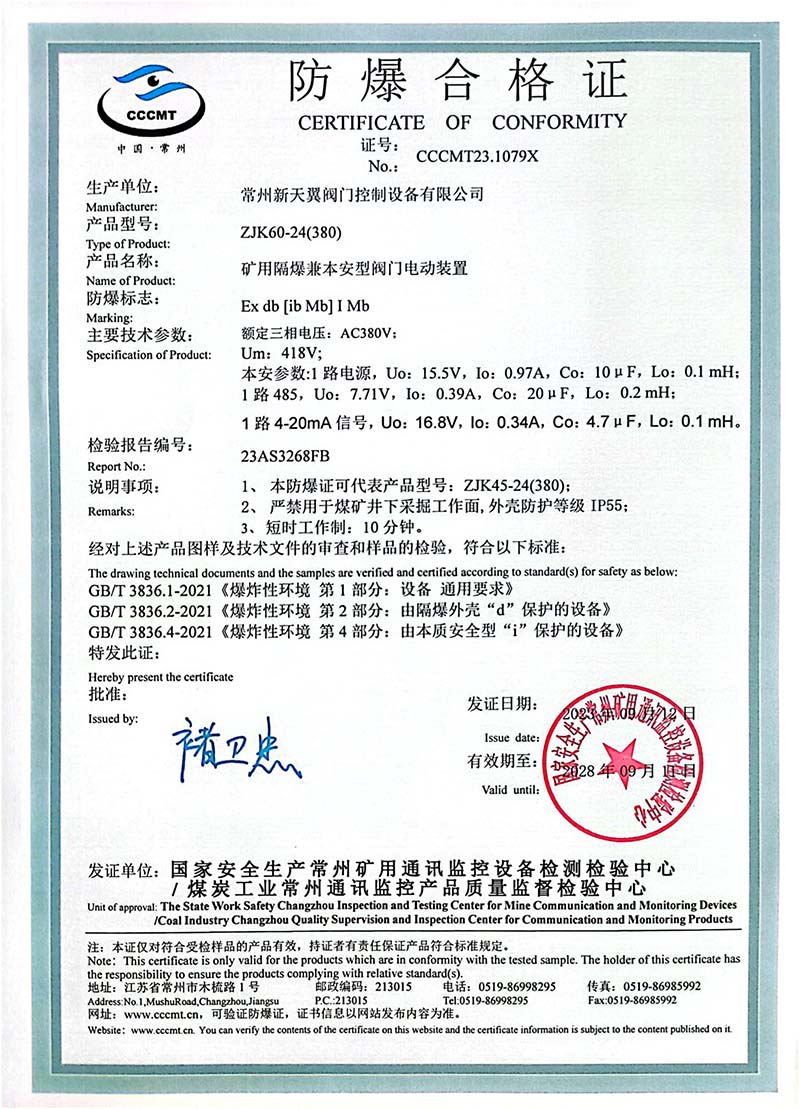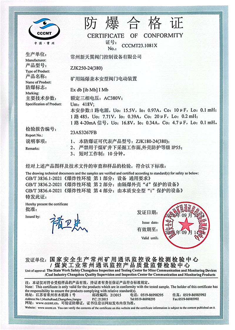 礦用產(chǎn)品安全標志證書ZJK20-24(380)