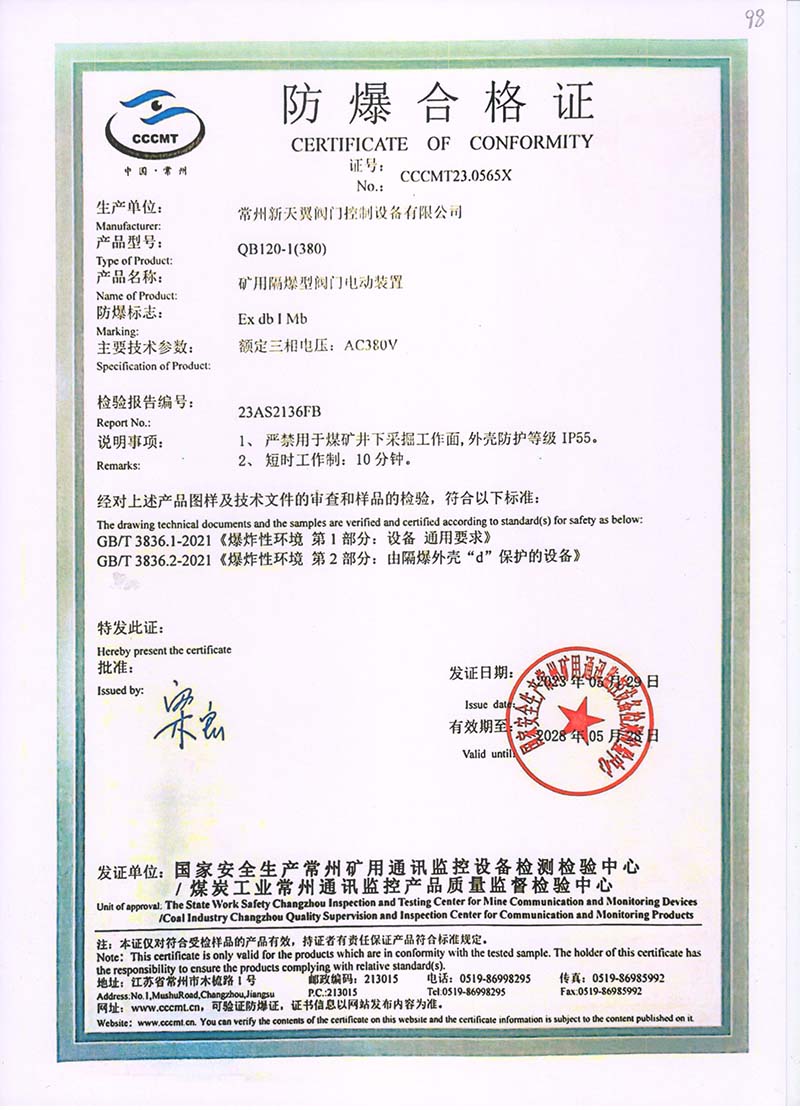 礦用產(chǎn)品安全標志證書QB120-1(380)