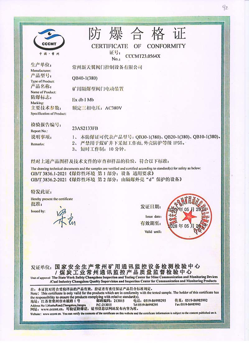 礦用產(chǎn)品安全標志證書QB40-1(380)