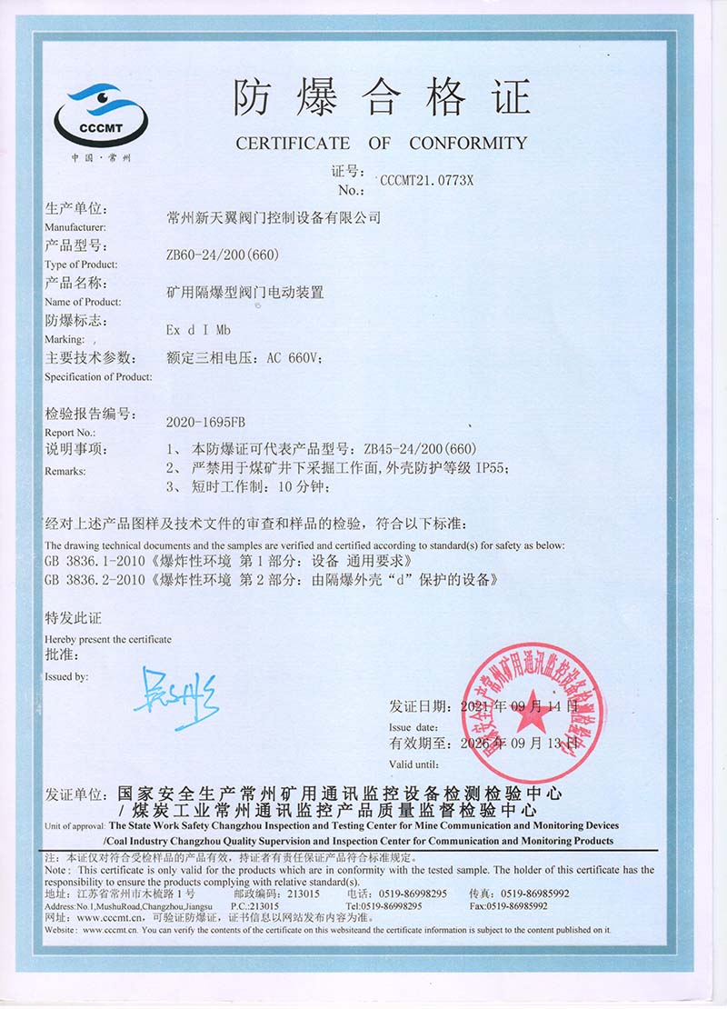 礦用隔爆ZB10-24中國國家強制性產(chǎn)品認證證書110.1